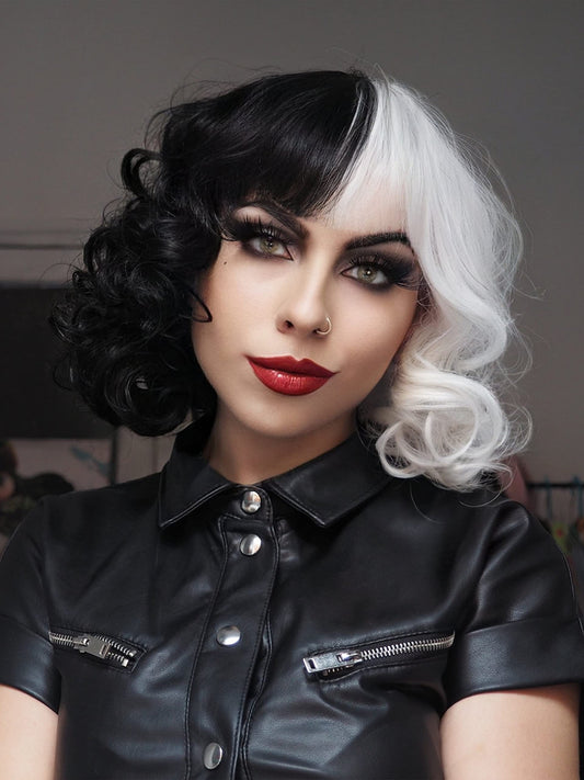 14 inches Half Black and White Wig with Bangs Shoulder Length Curly Wavy Wig